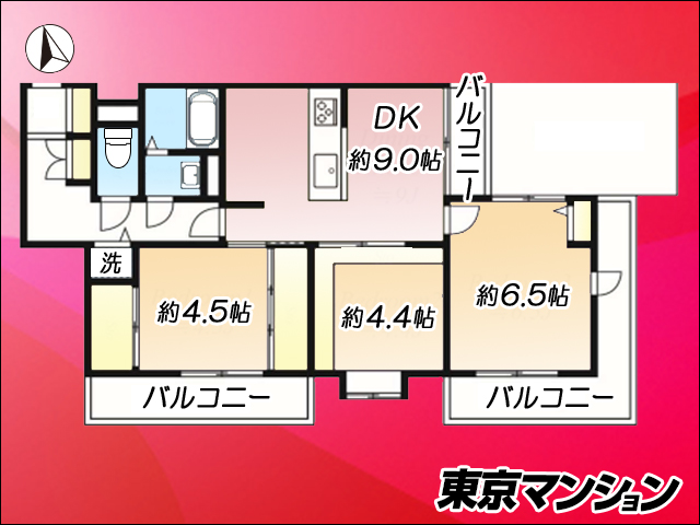 | バルコニー(主要採光面) | 12.82m2(3.87坪) 東向き | ||